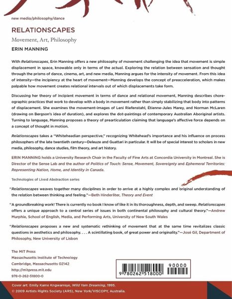 A new philosophy of movement that explores the active relation between sensation and thought through the prisms of dance, cinema, art, and new media.With Relationscapes, Erin Manning offers a new philosophy of movement challenging the idea that movement is simple displacement in space, knowable only in terms of the actual. Exploring the relation between sensation and thought through the prisms of dance, cinema, art, and new media, Manning argues for the intensity of movement. From this idea of intensity the incipiency at the heart of movement Manning develops the concept of preacceleration, which makes palpable how movement creates relational intervals out of which displacements take form.Discussing her theory of incipient movement in terms of dance and relational movement, Manning describes choreographic practices that work to develop with a body in movement rather than simply stabilizing that body into patterns of displacement. She examines the movement-images of Leni Riefenstahl, Étienne-Jules Marey, and Norman McLaren (drawing on Bergson's idea of duration), and explores the dot-paintings of contemporary Australian Aboriginal artists. Turning to language, Manning proposes a theory of prearticulation claiming that language's affective force depends on a concept of thought in motion.Relationscapes takes a Whiteheadian perspective, recognizing Whitehead's importance and his influence on process philosophers of the late twentieth century Deleuze and Guattari in particular. It will be of special interest to scholars in new media, philosophy, dance studies, film theory, and art history.