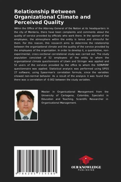Within the Office of the Attorney General of the Nation at its headquarters in the city of Monteria, there have been complaints and comments about the quality of service provided by officials who work there. In the opinion of the employees, the atmosphere within the entity is tense and stressful for them. For this reason, this research aims to determine the relationship between the organizational climate and the quality of the service provided by the employees of the organization. In order to develop it, a quantitative, non-experimental, cross-sectional correlational study was carried out. The study population consisted of 52 employees of the entity to whom the organizational climate questionnaire of Litwin and Stringer was applied and 52 users of the services provided by the office to whom the SERVPERF questionnaire was applied. Statistical analysis was performed using SPSS 27 software, using Spearman's correlation formula, since the variables showed non-normal behavior. As a result of the analysis it was found that there was a correlation of -0.002 between the study variables.