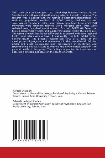 This study aims to investigate the relationship between self-worth and Transliminality with general health among artists in the field of cinema. The research type is applied, and the method is descriptive-correlational. The statistical population consists of 1,000 artists, including actors, screenwriters, directors, editors, and cinematographers, from which 278 individuals were randomly selected using Morgan's table. Data were collected using standard questionnaires: Crocker's Self-Worth Scale, the Revised Transliminality Scale, and Goldberg's General Health Questionnaire. The results showed that higher self-worth is associated with better general health, and artists with a lower Transliminality threshold exhibit better general health. The present research can serve as a basis for the development of programs and interventions in the mental health field for artists and assist policymakers and professionals in identifying and strengthening positive factors to improve the psychological condition and general health of this group. The findings emphasize the importance of addressing psychological issues in the health of artists.
