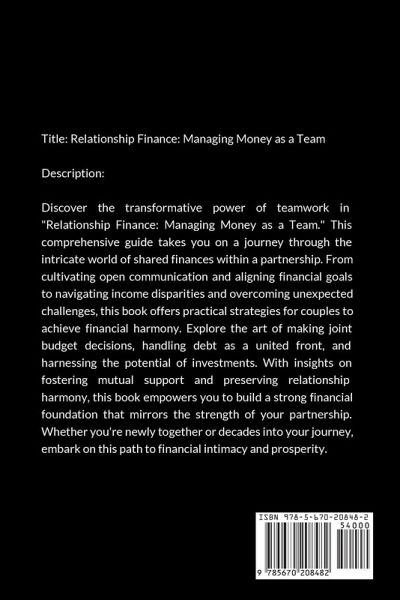 Title: Relationship Finance: Managing Money as a Team Description: Discover the transformative power of teamwork in "Relationship Finance: Managing Money as a Team." This comprehensive guide takes you on a journey through the intricate world of shared finances within a partnership. From cultivating open communication and aligning financial goals to navigating income disparities and overcoming unexpected challenges, this book offers practical strategies for couples to achieve financial harmony. Explore the art of making joint budget decisions, handling debt as a united front, and harnessing the potential of investments. With insights on fostering mutual support and preserving relationship harmony, this book empowers you to build a strong financial foundation that mirrors the strength of your partnership. Whether you're newly together or decades into your journey, embark on this path to financial intimacy and prosperity.