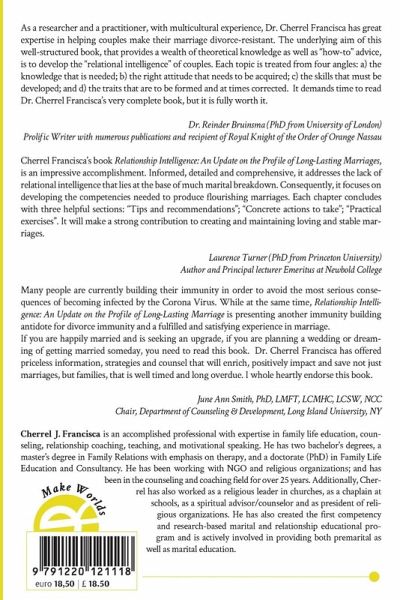 As a researcher and a practitioner, with multicultural experience, Dr. Cherrel Francisca has great expertise in helping couples make their marriage divorce-resistant. The underlying aim of this well-structured book, that provides a wealth of theoretical knowledge as well as "how-to" advice, is to develop the "relational intelligence" of couples. Each topic is treated from four angles: a) the knowledge that is needed; b) the right attitude that needs to be acquired; c) the skills that must be developed; and d) the traits that are to be formed and at times corrected. It demands time to read Dr. Cherrel Francisca's very complete book, but it is fully worth it. Dr. Reinder Bruinsma (PhD from University of London) Prolific Writer with numerous publications and recipient of Royal Knight of the Order of Orange Nassau Cherrel Francisca's book Relationship Intelligence: An Update on the Profile of Long-Lasting Marriages, is an impressive accomplishment. Informed, detailed and comprehensive, it addresses the lack of relational intelligence that lies at the base of much marital breakdown. Consequently, it focuses on developing the competencies needed to produce flourishing marriages. Each chapter concludes with three helpful sections: "Tips and recommendations"; "Concrete actions to take"; "Practical exercises". It will make a strong contribution to creating and maintaining loving and stable marriages. Laurence Turner (PhD from Princeton University) Author and Principal lecturer Emeritus at Newbold College Many people are currently building their immunity in order to avoid the most serious consequences of becoming infected by the Corona Virus. While at the same time, Relationship Intelligence: An Update on the Profile of Long-Lasting Marriage is presenting another immunity building antidote for divorce immunity and a fulfilled and satisfying experience in marriage. If you are happily married and is seeking an upgrade, if you are planning a wedding or dreaming of getting married someday, you need to read this book. Dr. Cherrel Francisca has offered priceless information, strategies and counsel that will enrich, positively impact and save not just marriages, but families, that is well timed and long overdue. I whole heartly endorse this book. June Ann Smith, PhD, LMFT, LCMHC, LCSW, NCC Chair, Department of Counseling & Development, Long Island University, NY Cherrel J. Francisca is an accomplished professional with expertise in family life education, counseling, relationship coaching, teaching, and motivational speaking. He has two bachelor's degrees, a master's degree in Family Relations with emphasis on therapy, and a doctorate (PhD) in Family Life Education and Consultancy. He has been working with NGO and religious organizations; and has been in the counseling and coaching field for over 25 years. Additionally, Cherrel has also worked as a religious leader in churches, as a chaplain at schools, as a spiritual advisor/counselor and as president of religious organizations. He has also created the first competency and research-based marital and relationship educational program and is actively involved in providing both premarital as well as marital education.