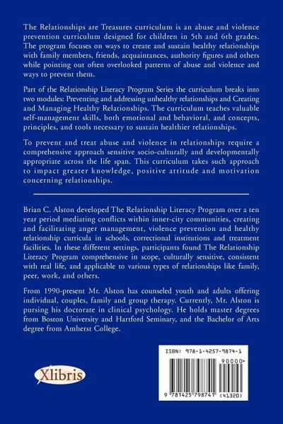 The Relationships are Treasures curriculum is an abuse and violence prevention curriculum designed for children in 5th and 6th grades. The program focuses on ways to create and sustain healthy relationships with family members, friends, acquaintances, authority figures and others while pointing out often overlooked patterns of abuse and violence and ways to prevent them. Part of the Relationship Literacy Program Series the curriculum breaks into two modules: Preventing and addressing unhealthy relationships and Creating and Managing Healthy Relationships. The curriculum teaches valuable self-management skills, both emotional and behavioral, and concepts, principles, and tools necessary to sustain healthier relationships. To prevent and treat abuse and violence in relationships require a comprehensive approach sensitive socio-culturally and developmentally appropriate across the life span. This curriculum takes such approach to impact greater knowledge, positive attitude and motivation concerning relationships.
