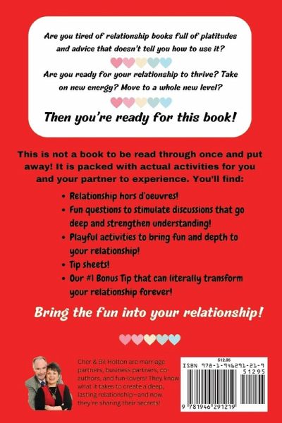 A successful relationship requires work and commitment, on the part of both partners. And it isn't always joyful. Sometimes you disagree-in fact, if you never disagree, someone isn't being honest in their communication! It's learning how to share different viewpoints, broach difficult subjects, handle rocky roads, and come out the other side stronger, with more partnering skills in your tool kit! And it is worth every moment, because as you grow together, it really is true: The best is ALWAYS yet to come! This relationship guide is a sampling of the relationship building practices of couples who do things together, because they want to do things together! These relationship practices are some of the foundational practices that strengthen the incredible bond between significant other couples-bonds built of trust, communication, honesty, and vulnerability. There are four major categories in this book:Relationship Hors d'Oeuvres! That's our term for this collection of powerful tidbits of advice we've created. For each Hors d'Oeuvre, we invite you to spend time together "digesting" it. We've included a series of conversational prompts to stimulate your conversation. Remember, that is simply the beginning. Allow your discussion to dig deep and really have meaningful conversation surrounding each hors d'oeuvre you select. Fun Questions to Stimulate Discussions that can Go Deep and Strengthen Understanding! We've discovered that one of the most relationship-enriching activities you can experience is deep-diving together into fun questions that allow you to authentically reveal your vulnerability with each other ... risk-free! While these "Suppose ..." questions may appear to be light-hearted and even somewhat shallow on the surface, trust us! Each one provides the opportunity for a deeper conversation that can be eye (and heart) opening! Playful Activities to Bring Fun to Your Relationship! One of the greatest discoveries we made as we strengthened our own relationship was the power of FUN! We also realized that we had to make fun a priority; otherwise, life just gets in the way! In this section, we are sharing a variety of activities that you can easily do together. It simply requires you to schedule the time and make it a priority! You're welcome!! An Appendix You Don't Want to Cut Out: Tip Sheets! We found that this book just would not stop writing itself! Every time we thought we were finished, we'd think of one more thing to include! That's why we added the Appendix, which includes a few Tip Sheets, offering our top five tips to deal with specific "pressure points" in relationships. We invite you to check out these tips, then add your own spin to the issues that affect your relationship. Plus (drumroll, please) we wrap everything up with our #1 Bonus Tip that can literally transform your relationship forever! (And it works in other situations in your life as well!)
