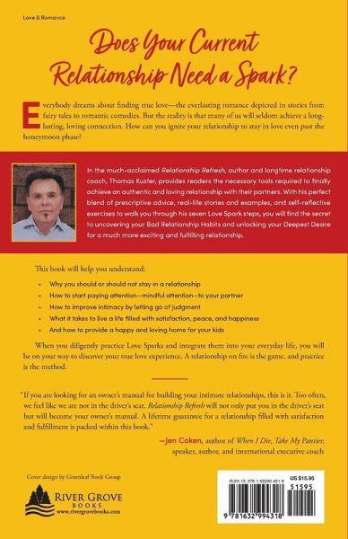Does Your Current Relationship Need a Spark? Everybody dreams about finding true love-the everlasting romance depicted in stories from fairy tales to romantic comedies. But the reality is that many of us will seldom achieve a long-lasting, loving connection. How can you ignite your relationship to stay in love even past the honeymoon phase? In the much-acclaimed Relationship Refresh, author and longtime relationship coach, Thomas Kuster, provides readers the necessary tools required to finally achieve an authentic and loving relationship with their partners. With his perfect blend of prescriptive advice, real-life stories and examples, and self-reflective exercises to walk you through his seven Love Spark steps, you will find the secret to uncovering your Bad Relationship Habits and unlocking your Deepest Desire for a much more exciting and fulfilling relationship. This book will help you understand: -Why you should or should not stay in a relationship -How to start paying attention-mindful attention- to your partner -How to improve intimacy by letting go of judgment - What it takes to live a life filled with satisfaction, peace, and happiness -And how to provide a happy and loving home for your kids When you diligently practice Love Sparks and integrate them into your everyday life, you will be on your way to discover your true love experience. A relationship on fire is the game, and practice is the method.