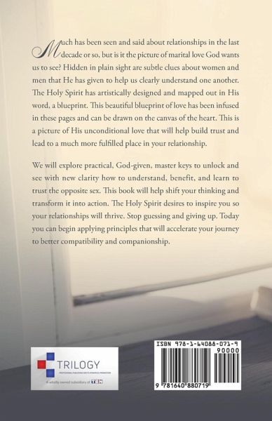 Much has been seen and said about relationships in the last decade or so,but is it the picture of marital love God wants us to see? Hidden in plain sight are subtle clues about women and men that He has given to help us clearly understand one another. The Holy Spirit has artistically designed and mapped out in His word,a blueprint. This beautiful blueprint of love has been infused in these pages and can be drawn on the canvas of the heart. This is a picture of His unconditional love that will help build trust and lead to a much more fulfilled place in your relationship. We will explore practical,God-given,master keys to unlock and see with new clarity how to understand, benefit, and learn to trust the opposite sex. This book will help shift your thinking and transform it into action. The Holy Spirit desires to inspire you so your relationships will thrive. Stop guessing and giving up. Today you can begin applying principles that will accelerate your journey to better compatibility and companionship.
