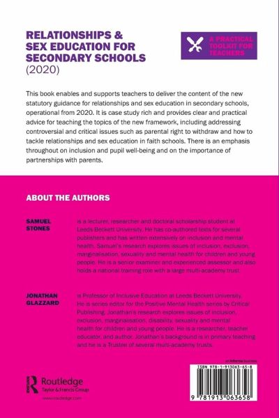 Introduction and context 1. Families 2. Character 3. Relationships 4. Online and media 5. Being safe 6. Health education 7. Intimate and sexual relationships 8. Teaching RSE in faith schools 9. Working in partnership with parents and external agencies 10. Relationships and sex education for students with special needs Conclusion References Index Appendix with guidance for parents