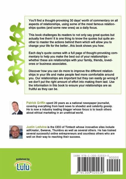 You'll find a thought-provoking 30 days' worth of commentary on all aspects of relationships, using some of the most famous relationships quotes (and some new ones) as a daily focus. This book challenges its readers to not only say great quotes but actually live them! It is one thing to know the quotes but quite another to master the actions behind them which will allow you to change your life for the better...this book shows you how. Each day's quote comes with a full page of thought-provoking commentary to help you make the best out of your relationships - whether these are relationships with your family, friends, loved-ones or business associates. Discover how you can do more to improve the different relationships in your life and make people feel more comfortable around you. Our relationships are important but they can easily go wrong if we don't put the right amount of effort into making them last. Use the information in this book to ensure your relationships are as fruitful as they can be.