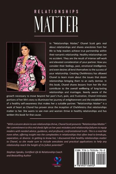 In Relationships Matter, Chanel Scott gets real about relationships and shares anecdotes from her life to help readers achieve true partnership within their romantic relationship. ¿¿¿¿Healthy relationships are no accident. They are the result of intense self-work and elevated consideration of your partner. How you consider their feelings, past, emotional intelligence, and even desires all lend themselves to the success of your relationship. Creating CheMinistry has allowed Chanel to learn more about the issues that doom relationships bringing them to an early demise. In this book, Chanel shares lessons from her life that contribute to the overall well-being of long-lasting relationships and marriages. Keenly aware of the growth necessary to move beyond her past's hurt, pain, and frustration, Chanel intimates portions of her life's story to illuminate her journey of enlightenment and the establishment of a healthy self-awareness that makes her a suitable partner. Relationships Matter is a work of the heart as Chanel has proven since the inception of CheMinistry that relationships matter to her. She wants to see men and women thrive in healthy relationships and has written this book for that cause.