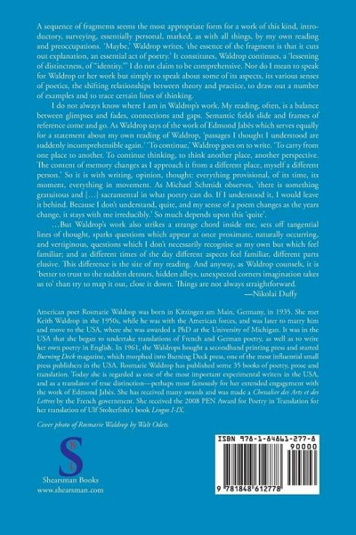 "A sequence of fragments seems the most appropriate form for a work of this kind, introductory, surveying, essentially personal, marked, as with all things, by my own reading and preoccupations. 'Maybe,' Waldrop writes, 'the essence of the fragment is that it cuts out explanation, an essential act of poetry.' It constitutes, Waldrop continues, a 'lessening of distinctness, of "identity."' I do not claim to be comprehensive. Nor do I mean to speak for Waldrop or her work but simply to speak about some of its aspects, its various senses of poetics, the shifting relationships between theory and practice, to draw out a number of examples and to trace certain lines of thinking, ways of thinking." - Nikolai Duffy