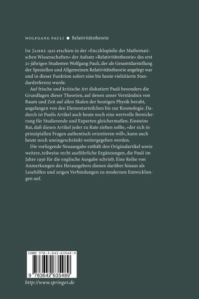 Im Alter von 21 Jahren hat W. Pauli einen Handbuchartikel zur Relativitätstheorie verfaßt, der bis heute gelesen und zitiert wird. Er ist wohl der berühmteste Text zum Thema und wurde nicht zuletzt von A. Einstein begeistert gewürdigt. Die vorliegende Neuausgabe enthält den Originalartikel sowie weitere, teilweise recht ausführliche Ergänzungen, die Pauli im Jahre 1956 für die englische Ausgabe schrieb. Eine Reihe von Anmerkungen des Herausgebers dienen darüber hinaus als Lesehilfen und zeigen Verbindungen zu modernen Entwicklungen auf.