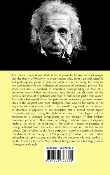 The present book is intended, as far as possible, to give an exact insight into the theory of Relativity to those readers who, from a general scientific and philosophical point of view, are interested in the theory, but who are not conversant with the mathematical apparatus of theoretical physics. The work presumes a standard of education corresponding to that of a university matriculation examination, and, despite the shortness of the book, a fair amount of patience and force of will on the part of the reader. The author has spared himself no pains in his endeavor to present the main ideas in the simplest and most intelligible form, and on the whole, in the sequence and connection in which they actually originated. In the interest of clearness, it appeared to me inevitable that I should repeat myself frequently, without paying the slightest attention to the elegance of the presentation. I adhered scrupulously to the precept of that brilliant theoretical physicist L. Boltzmann, according to whom matters of elegance ought to be left to the tailor and to the cobbler. I make no pretence of having withheld from the reader difficulties which are inherent to the subject. On the other hand, I have purposely treated the empirical physical foundations of the theory in a "step-motherly" fashion, so that readers unfamiliar with physics may not feel like the wanderer who was unable to see the forest for the trees. May the book bring someone a few happy hours of suggestive thought!