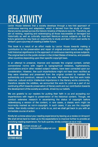 Relativity: The Special And General Theory, A Popular Exposition, Authorised Translation By Robert W. Lawson (Revised Edition) This book is a result of an effort made by us towards making a contribution to the preservation and repair of original classic literature. In an attempt to preserve, improve and recreate the original content, we have worked towards: 1. Type-setting & Reformatting: The complete work has been re-designed via professional layout, formatting and type-setting tools to re-create the same edition with rich typography, graphics, high quality images, and table elements, giving our readers the feel of holding a 'fresh and newly' reprinted and/or revised edition, as opposed to other scanned & printed (Optical Character Recognition - OCR) reproductions. 2. Correction of imperfections: As the work was re-created from the scratch, therefore, it was vetted to rectify certain conventional norms with regard to typographical mistakes, hyphenations, punctuations, blurred images, missing content/pages, and/or other related subject matters, upon our consideration. Every attempt was made to rectify the imperfections related to omitted constructs in the original edition via other references. However, a few of such imperfections which could not be rectified due to intentional\unintentional omission of content in the original edition, were inherited and preserved from the original work to maintain the authenticity and construct, relevant to the work. We believe that this work holds historical, cultural and/or intellectual importance in the literary works community, therefore despite the oddities, we accounted the work for print as a part of our continuing effort towards preservation of literary work and our contribution towards the development of the society as a whole, driven by our beliefs. We are grateful to our readers for putting their faith in us and accepting our imperfections with regard to preservation of the historical content. HAPPY READING!