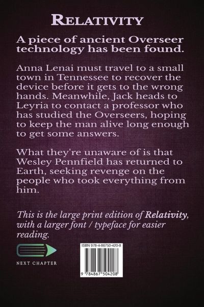 A piece of ancient Overseer technology has been found. Anna Lenai must travel to a small town in Tennessee to recover the device before it gets to the wrong hands. Meanwhile, Jack heads to Leyria to contact a professor who has studied the Overseers, hoping to keep the man alive long enough to get some answers. What they're unaware of is that Wesley Pennfield has returned to Earth, seeking revenge on the people who took everything from him. This is the large print edition of Relativity, with a larger font / typeface for easier reading.