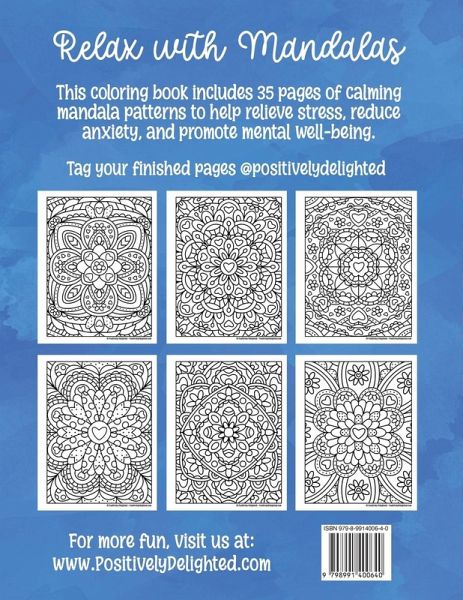 Feeling stressed? Relax with Mandalas! This coloring book includes 35 pages of mandala patterns to help relieve stress, reduce anxiety, and promote mental well-being. Whether you're looking to unwind after a long day, boost your mood, or simply indulge in a bit of creative fun, Relax with Mandalas offers a delightful journey of mindfulness and relaxation. Each page invites you to slow down and enjoy a moment of calm. Perfect for all ages and skill levels, this coloring book is more than just a collection of pages. It's a tool to break free of anxiety and find the peace and joy within. Grab your colored pencils and let the magic of mandalas quiet your mind and soothe your soul.