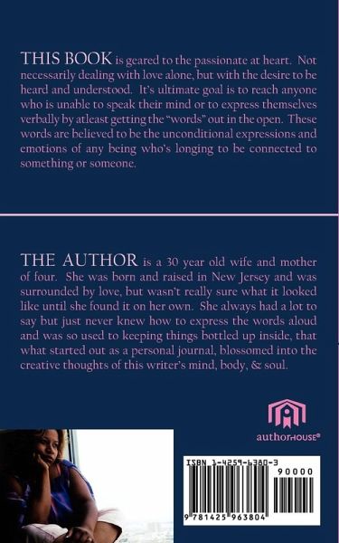 This book is geared to the passionate at heart. Not necessarily dealing with love alone, but with the desire to be heard and understood. It's ultimate goal is to reach anyone who is unable to speak their mind or to express themselves verbally by atleast getting the "words" out in the open. These words are believed to be the unconditional expressions and emotions of any being who's longing to be connected to something or someone.
