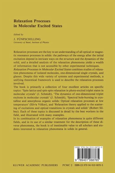 Relaxation phenomena of excited molecular states are abundant in all nature. They mediate such key processes as photochemical reactions or even the pathways of ordinary chemical reactions. However, for a long time the main research in electronic relaxation processes was concerned with anorganic solids, in part because of their great technological importance (photography, semiconductors ... ) in part also because these compounds were the "workhorses" of the solid state physicists. In the last 30 years, there was a steadily increasing interest in organic molecular systems, first in molecular crystals and later in all forms of molecular solids (glasses, polymers, membranes, ... ). The present volume combines papers on quite different types of relaxation phenomena: the type of solid studied, the electronic states involved, the physical processes responsible for the relaxations are all different. Nevertheless, after reading this book, a more clear and complete picture of the phenomenon "relaxa tion" emerges that proves that this volume is more than just a collection of individual articles. The volume starts with the paper "Spin-lattice and spin-spin relaxation in photo-excited triplet states in molecular crystals" by Jan Schmidt. Even in these seemingly simple systems of isolated guest molecules in a single crystal host, the relaxation phenomena are quite involved and a very thorough investigation is necessary to find the key relaxation processes. The end of the article provides a bridge to the following paper: it treats interactions of two molecules (dimers), where resonant interactions become important and lead to new, characteristic relaxation processes.