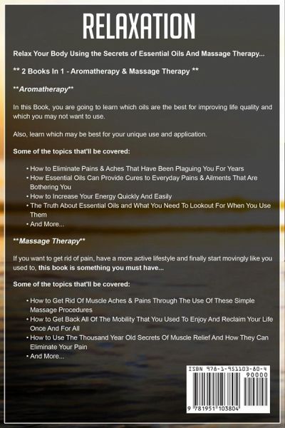 Relax Your Body Using The Secrets of Essential Oils And Massage Therapy... ¿¿ 2 Books In 1 - Aromatherapy & Massage Therapy ¿¿ **Aromatherapy** Do you have minor or possibly major health issues that are always plaguing you and that you’re looking for a cure for? Have you heard of "Essential Oils" and possibly even tried some of them to help you live a healthier life? The truth is, if you know which essential oils to use and how to use them, they can improve your life more than you ever thought possible. You can virtually eliminate many ailments and pains using nothing more than Essential Oils. In this Book, you are going to learn which oils are the best for improving life quality, which oils you may not want to use, which oil does what, and also learn which may be best for your unique use and application. Some of the topics that'll be covered: * How To Eliminate Pains & Aches That Have Been Plaguing You For Years * How Essential Oils Can Provide Cures To Everyday Pains & Ailments That Are Bothering You * How To Increase Your Energy Quickly And Easily * The Truth About Essential Oils And What You Need To Lookout For When You Use Them * And More... **Massage Therapy** Have you always wondered about massage therapy or maybe even had your doctor recommend it at some point? Would you like to know the true healing properties that can be gained from using massage in your life? Chances are, you’ve probably been held back by worry and just plain not knowing all the details about massage... If you want to get rid of pain, have a more active lifestyle and finally start movingly like you used to, this Book is something you must have... Some of the topics that'll be covered: * How To Get Rid Of Muscle Aches & Pains Through The Use Of These Simple Massage Procedures * How To Get Back All Of The Mobility That You Used To Enjoy And Reclaim Your Life Once And For All * How To Use The Thousand Year Old Secrets Of Muscle Relief And How They Can Eliminate Your Pain * And More... Don’t wait another moment to enjoy from this information – Get your copy of Relaxation right away!