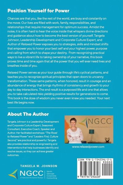 Chances are that you, like the rest of the world, are busy and constantly on the move. Our lives are filled with work, family, responsibilities, and relationships that require management for optimum success. Amidst the noise, it is often hard to hear the voice inside that whispers divine directions and guidance about how to become the best version of yourself. Tangela W. Johnson, Leadership Development and Corporate Culture Expert, and Author of Relaxed Power exposes you to strategies, skills and mindset shifts that empower you to honor your best self and your highest power, purpose and calling from which to shape your destiny. From recognizing practical ways to live a vibrant life to taking ownership of your narrative, this book proves time and time again that all the power that you will ever need lives and breathes inside of you.