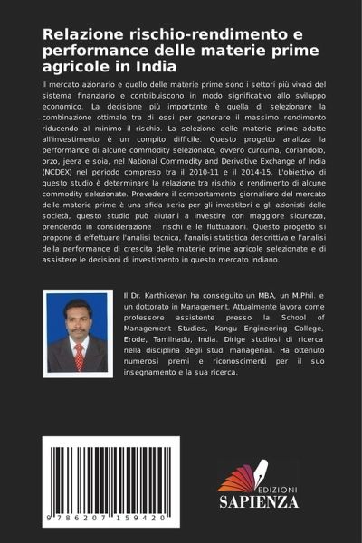 Il mercato azionario e quello delle materie prime sono i settori più vivaci del sistema finanziario e contribuiscono in modo significativo allo sviluppo economico. La decisione più importante è quella di selezionare la combinazione ottimale tra di essi per generare il massimo rendimento riducendo al minimo il rischio. La selezione delle materie prime adatte all'investimento è un compito difficile. Questo progetto analizza la performance di alcune commodity selezionate, ovvero curcuma, coriandolo, orzo, jeera e soia, nel National Commodity and Derivative Exchange of India (NCDEX) nel periodo compreso tra il 2010-11 e il 2014-15. L'obiettivo di questo studio è determinare la relazione tra rischio e rendimento di alcune commodity selezionate. Prevedere il comportamento giornaliero del mercato delle materie prime è una sfida seria per gli investitori e gli azionisti delle società, questo studio può aiutarli a investire con maggiore sicurezza, prendendo in considerazione i rischi e le fluttuazioni. Questo progetto si propone di effettuare l'analisi tecnica, l'analisi statistica descrittiva e l'analisi della performance di crescita delle materie prime agricole selezionate e di assistere le decisioni di investimento in questo mercato indiano.
