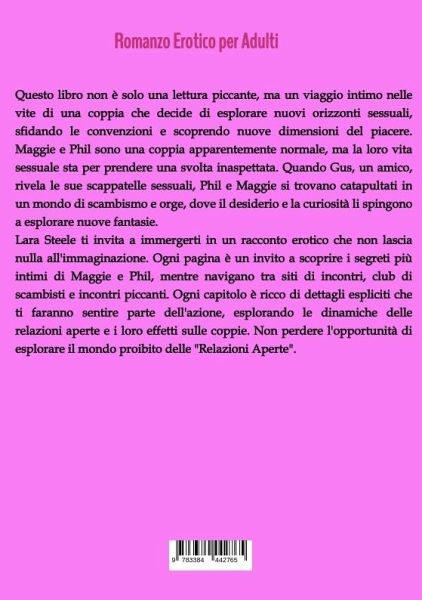 Questo libro non è solo una lettura piccante, ma un viaggio intimo nelle vite di una coppia che decide di esplorare nuovi orizzonti sessuali, sfidando le convenzioni e scoprendo nuove dimensioni del piacere. Maggie e Phil sono una coppia apparentemente normale, ma la loro vita sessuale sta per prendere una svolta inaspettata. Quando Gus, un amico, rivela le sue scappatelle sessuali, Phil e Maggie si trovano catapultati in un mondo di scambismo e orge, dove il desiderio e la curiosità li spingono a esplorare nuove fantasie.Lara Steele ti invita a immergerti in un racconto erotico che non lascia nulla all'immaginazione. Ogni pagina è un invito a scoprire i segreti più intimi di Maggie e Phil, mentre navigano tra siti di incontri, club di scambisti e incontri piccanti. Ogni capitolo è ricco di dettagli espliciti che ti faranno sentire parte dell'azione, esplorando le dinamiche delle relazioni aperte e i loro effetti sulle coppie. Non perdere l'opportunità di esplorare il mondo proibito delle "Relazioni Aperte".