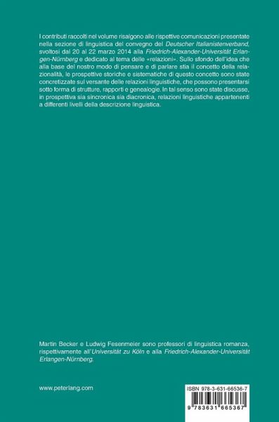 I contributi raccolti nel volume risalgono alle rispettive comunicazioni presentate nella sezione di linguistica del convegno del Deutscher Italianistenverband , svoltosi dal 20 al 22 marzo 2014 alla Friedrich-Alexander-Universität Erlangen-Nürnberg e dedicato al tema delle "relazioni". Sullo sfondo dell'idea che alla base del nostro modo di pensare e di parlare stia il concetto della relazionalità, le prospettive storiche e sistematiche di questo concetto sono state concretizzate sul versante delle relazioni linguistiche, che possono presentarsi sotto forma di strutture, rapporti e genealogie. In tal senso sono state discusse, in prospettiva sia sincronica sia diacronica, relazioni linguistiche appartenenti a differenti livelli della descrizione linguistica.