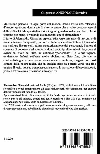 Moltissime persone, in ogni parte del mondo, hanno avuto una relazione d'amore, qualcuna durata più di altre, e sanno che a volte possono esserci delle difficoltà. Ma quanti di noi si sciolgono guardando due vecchietti che si tengono per mano, o vedendo due ragazzini che si abbracciano? Il testo di Alessandro Gianesini esplora, attraverso una serie di racconti e di storie intense e complicate, l'amore in tutte le sue sfaccettature. Grazie alla sua scrittura lineare e alla caratterizzazione dei personaggi, l'autore ti consente di conoscere ed entrare in alcuni prototipi di relazioni che, come si evince dal titolo del libro, lui definisce "pericolose". Ha le sue ragioni, ovviamente. Infatti, sebbene molte abbiano un lieto fine, ciò che le contraddistingue è una trama sicuramente complessa, magari non così lontana dalla nostra realtà, che in qualche caso ha portato verso una fine tragica. Il testo, nel suo complesso, attraverso la narrazione di brevi racconti, porta il lettore a una riflessione introspettiva. Das Urheberrecht an bibliographischen und produktbeschreibenden Daten und an den bereitgestellten Bildern liegt bei Informazioni Editoriali, I.E. S.r.l., oder beim Herausgeber oder demjenigen, der die Genehmigung erteilt hat. Alle Rechte vorbehalten.
