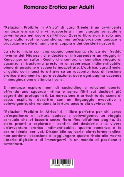 "Relazioni Proibite in Africa" di Lara Steele è un avvincente romanzo erotico che vi trasporterà in un viaggio sensuale e avventuroso nel cuore dell'Africa. Questo libro non è solo una fuga dalla routine quotidiana, ma un'esplorazione audace e provocante delle dinamiche di coppia e dei desideri nascosti.La storia inizia con una coppia americana, stanca del freddo inverno del Midwest, che decide di intraprendere un viaggio in Kenya per un safari. Quello che sembra un semplice viaggio di vacanza si trasforma presto in un'esperienza indimenticabile, piena di passione e scoperte inaspettate. L'autrice, Lara Steele, ci guida con maestria attraverso un racconto ricco di tensione erotica e momenti di pura seduzione, dove ogni pagina accende l'immaginazione e stimola i sensi.Il romanzo esplora temi di cuckolding e relazioni aperte, offrendo uno sguardo intimo e senza filtri sui desideri più segreti dei protagonisti. La narrazione è arricchita da scene di sesso esplicito, descritte con unlinguaggio evocativo e coinvolgente, che rendono la lettura ancora più avvincente."Relazioni Proibite in Africa" è il libro perfetto per chi cerca un'esperienza di lettura audace e coinvolgente, un viaggio sensuale che vi lascerà senza fiato fino all'ultima pagina. Se siete pronti a esplorare i confini del desiderio e a vivere un'avventura erotica indimenticabile, questo romanzo è la scelta ideale per voi. Disponibile su varie piattaforme online, non perdete l'occasione di aggiungere questo titolo alla vostra libreria digitale e di immergervi in un mondo di passione e avventura.