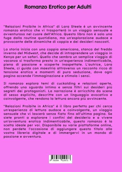 "Relazioni Proibite in Africa" di Lara Steele è un avvincente romanzo erotico che vi trasporterà in un viaggio sensuale e avventuroso nel cuore dell'Africa. Questo libro non è solo una fuga dalla routine quotidiana, ma un'esplorazione audace e provocante delle dinamiche di coppia e dei desideri nascosti.La storia inizia con una coppia americana, stanca del freddo inverno del Midwest, che decide di intraprendere un viaggio in Kenya per un safari. Quello che sembra un semplice viaggio di vacanza si trasforma presto in un'esperienza indimenticabile, piena di passione e scoperte inaspettate. L'autrice, Lara Steele, ci guida con maestria attraverso un racconto ricco di tensione erotica e momenti di pura seduzione, dove ogni pagina accende l'immaginazione e stimola i sensi.Il romanzo esplora temi di cuckolding e relazioni aperte, offrendo uno sguardo intimo e senza filtri sui desideri più segreti dei protagonisti. La narrazione è arricchita da scene di sesso esplicito, descritte con unlinguaggio evocativo e coinvolgente, che rendono la lettura ancora più avvincente."Relazioni Proibite in Africa" è il libro perfetto per chi cerca un'esperienza di lettura audace e coinvolgente, un viaggio sensuale che vi lascerà senza fiato fino all'ultima pagina. Se siete pronti a esplorare i confini del desiderio e a vivere un'avventura erotica indimenticabile, questo romanzo è la scelta ideale per voi. Disponibile su varie piattaforme online, non perdete l'occasione di aggiungere questo titolo alla vostra libreria digitale e di immergervi in un mondo di passione e avventura.