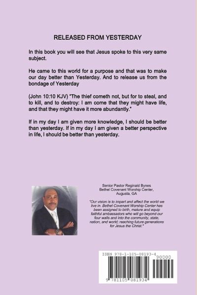 RELEASED FROM YESTERDAY: In this book you will see that Jesus spoke to this very same subject. He came to this world for a purpose and that was to make our day better than Yesterday. And to release us from the bondage of Yesterday (John 10:10 KJV) "The thief cometh not, but for to steal, and to kill, and to destroy: I am come that they might have life, and that they might have it more abundantly." If in my day I am given more knowledge, I should be better than yesterday. If in my day I am given a better perspective in life, I should be better than yesterday.