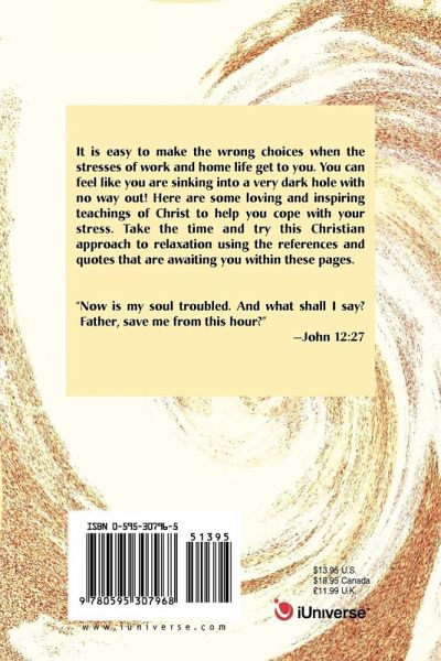 It is easy to make the wrong choices when the stresses of work and home life get to you. You can feel like you are sinking into a very dark hole with no way out! Here are some loving and inspiring teachings of Christ to help you cope with your stress. Take the time and try this Christian approach to relaxation using the references and quotes that are awaiting you within these pages. "Now is my soul troubled. And what shall I say? Father, save me from this hour?"--John 12:27