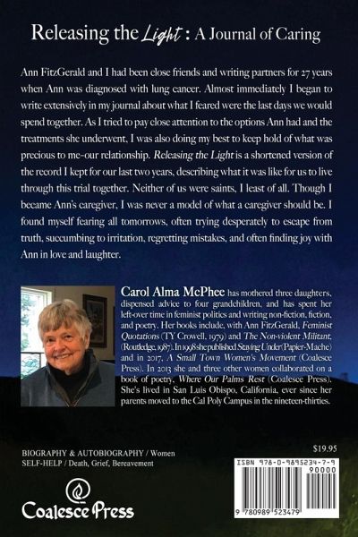 Ann FitzGerald and I had been close friends and writing partners for 27 years when Ann was diagnosed with lung cancer. Almost immediately I began to write extensively in my journal about what I feared were the last days we would spend together. As I tried to pay close attention to the options Ann had and the treatments she underwent, I was also doing my best to keep hold of what was precious to me - our relationship. Releasing the Light is a shortened version of the record I kept for our last two years, describing what it was like for us to live through this trial together. Neither of us were saints, I least of all. Though I became Ann's caregiver, I was never a model of what a caregiver should be. I found myself fearing all tomorrows, often trying desperately to escape from truth, succumbing to irritation, regretting mistakes, and often finding joy with Ann in love and laughter.