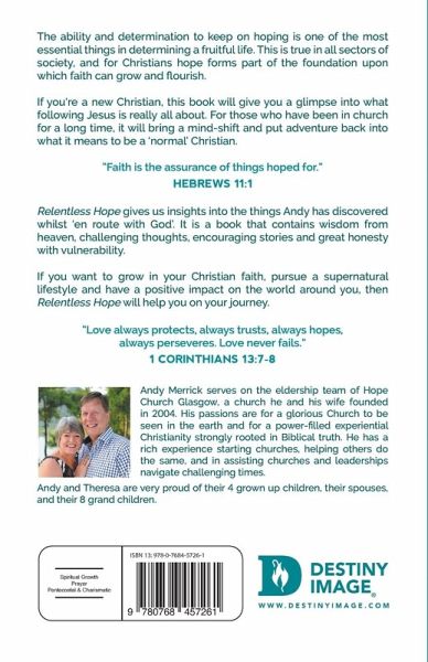 The ability and determination to keep on hoping is one of the most essential things in determining a fruitful life. This is true in all sectors of society, and for Christians hope forms part of the foundation upon which faith can grow and flourish. If you're a new Christian, this book will give you a glimpse into what following Jesus is really all about. For those who have been in church for a long time, it will bring a mind-shift and put adventure back into what it means to be a 'normal' Christian. "Faith is the assurance of things hoped for." Hebrews 11:1 Relentless Hope gives us insights into the things Andy has discovered whilst 'en route with God'. It is a book that contains wisdom from heaven, challenging thoughts, encouraging stories and great honesty with vulnerability. If you want to grow in your Christian faith, pursue a supernatural lifestyle and have a positive impact on the world around you, then Relentless Hope will help you on your journey. "Love always protects, always trusts, always hopes, always perseveres. Love never fails." 1 Corinthians 13:7-8