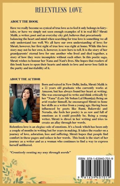 Take a moment and think of 'Heer Ranjha', 'Soni Mahiwal', 'Layla Majnu' or even 'Romeo and Juliet'. What do they all have in common? The one glaring answer is that these tales are testimonies of true love. Even though all these stories are fiction, it is safe to assume they must be inspired by real people who lived at some point in history. Perhaps it is this very fictionalization of romance that has our generation so cynical about whether true love of such magnitude can even exist for real. In this book, Shruti Malik has set out to dispute just that. To honour true love in its raw, vulnerable and exquisite moments, she tells the tale of her late grandparents who not only raised her but were also the source of a beautiful story. Through the heartbreak of losing them, she could think of no other way to pay tribute to them other than by having their lives eternalized in print. And just like the old masters wrote the tales of 'Heer Ranjha' or 'Romeo and Juliet', she too wishes to portray the beauty of a love story with the swaying tones of poetic form.