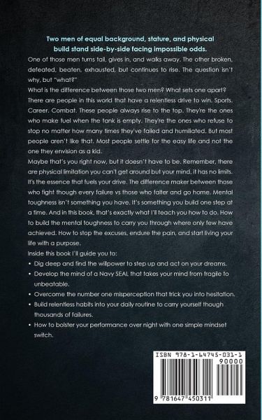 Two men of equal background, stature, and physical build stand side-by-side facing impossible odds. One of those men turns tail, gives in, and walks away. The other broken, defeated, beaten, exhausted, but continues to rise. The question isn't why, but "what?" What is the difference between those two men? What sets one apart? There are people in this world that have a relentless drive to win. Sports. Career. Combat. These people always rise to the top. They're the ones who make fuel when the tank is empty. They're the ones who refuse to stop no matter how many times they've failed and humiliated. But most people aren't like that. Most people settle for the easy life and not the one they envision as a kid. Maybe that's you right now, but it doesn't have to be. Remember, there are physical limitation you can't get around but your mind, it has no limits. It's the essence that fuels your drive. The difference maker between those who fight though every failure vs those who falter and go home. Mental toughness isn't something you have. It's something you build one step at a time. And in this book, that's exactly what I'll teach you how to do. How to build the mental toughness to carry you through where only few have achieved. How to stop the excuses, endure the pain, and start living your life with a purpose. Inside this book I'll guide you to:Dig deep and find the willpower to step up and act on your dreams. Develop the mind of a Navy SEAL that takes your mind from fragile to unbeatable. Overcome the number one misperception that trick you into hesitation. Build relentless habits into your daily routine to carry yourself though thousands of failures. How to bolster your performance over night with one simple mindset switch. This book isn't meant to make you feel good. Only buy this book if you're ready to get real with yourself and take serious action. The methods in this guide will get you results, but only if you follow my guidance and move with a purpose. You CAN learn to think and behave and adapt like a warrior. It IS possible. If that's what you're searching for, then this book is right for you. Scroll up and order your copy of Mental Toughness now!
