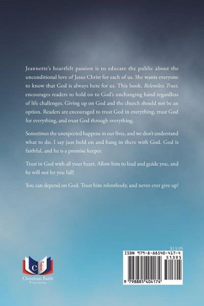Jeannette's heartfelt passion is to educate the public about the unconditional love of Jesus Christ for each of us. She wants everyone to know that God is always here for us. This book, Relentless Trust, encourages readers to hold on to God's unchanging hand regardless of life challenges. Giving up on God and the church should not be an option. Readers are encouraged to trust God in everything, trust God for everything, and trust God through everything. Sometimes the unexpected happens in our lives, and we don't understand what to do. I say just hold on and hang in there with God. God is faithful, and he is a promise keeper. Trust in God with all your heart. Allow him to lead and guide you, and he will not let you fall! You can depend on God. Trust him relentlessly, and never ever give up!