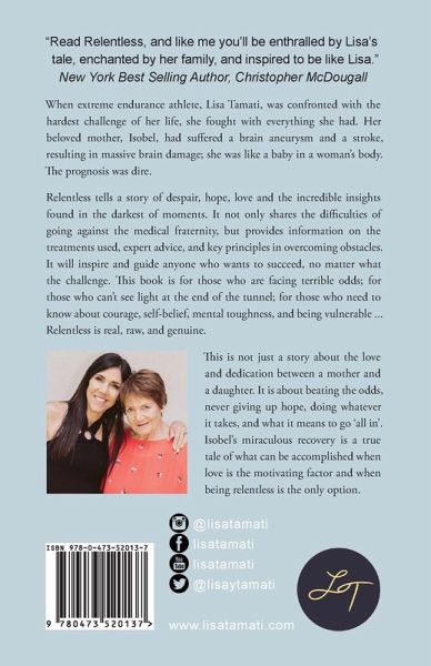 When extreme endurance athlete, Lisa Tamati, was confronted with the hardest challenge of her life, she fought with everything she had. Her beloved mother, Isobel, had suffered a brain aneurysm and a stroke, resulting in massive brain damage; she was like a baby in a woman's body. The prognosis was dire. Relentless tells a story of despair, hope, love and the incredible insights found in the darkest of moments. It not only shares the difficulties of going against the medical fraternity, but provides information on the treatments used, expert advice, and key principles in overcoming obstacles. It will inspire and guide anyone who wants to succeed, no matter what the challenge. This book is for those who are facing terrible odds; for those who can't see light at the end of the tunnel; for those who need to know about courage, self-belief, mental toughness, and being vulnerable ... Relentless is real, raw, and genuine. This is not just a story about the love and dedication between a mother and a daughter. It is about beating the odds, never giving up hope, doing whatever it takes, and what it means to go 'all in'. Isobel's miraculous recovery is a true tale of what can be accomplished when love is the motivating factor and when being relentless is the only option.