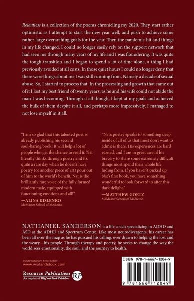 Relentless is a collection of the poems chronicling my 2020. They start rather optimistic as I attempt to start the new year well, and push to achieve some rather large overarching goals for the year. Then the pandemic hit and things in my life changed. I could no longer easily rely on the support network that had seen me through many years of my life and I was floundering. It was quite the tough transition and I began to spend a lot of time alone, a thing I had previously avoided at all costs. In those quiet hours I could no longer deny that there were things about me I was still running from. Namely a decade of sexual abuse. So, I started to process that. In the processing and growth that came out of it I lost my best friend of twenty years, as he and his wife could not abide the man I was becoming. Through it all though, I kept at my goals and achieved the bulk of them despite it all, and perhaps more impressively, I managed to not lose myself in it all.