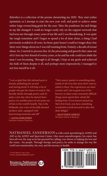 Relentless is a collection of the poems chronicling my 2020. They start rather optimistic as I attempt to start the new year well, and push to achieve some rather large overarching goals for the year. Then the pandemic hit and things in my life changed. I could no longer easily rely on the support network that had seen me through many years of my life and I was floundering. It was quite the tough transition and I began to spend a lot of time alone, a thing I had previously avoided at all costs. In those quiet hours I could no longer deny that there were things about me I was still running from. Namely a decade of sexual abuse. So, I started to process that. In the processing and growth that came out of it I lost my best friend of twenty years, as he and his wife could not abide the man I was becoming. Through it all though, I kept at my goals and achieved the bulk of them despite it all, and perhaps more impressively, I managed to not lose myself in it all.