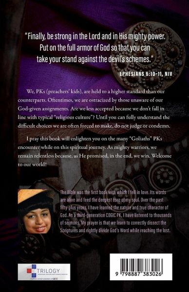 " Finally, be strong in the Lord and in His mighty power. Put on the full armor of God so that you can take your stand against the devil's schemes. " EPHESIANS 6 :10-11, NIV We, PKs (preachers' kids), are held to a higher standard than our counterparts. Oftentimes, we are ostracized by those unaware of our God-given assignments. Are we less accepted because we don't fall in line with typical "religious culture"? Until you can fully understand the difficult choices we are often forced to make, do not judge or condemn. I pray this book will enlighten you on the many "Goliaths" PKs encounter while on this spiritual journey. As mighty warriors, we remain relentless because, as He promised, in the end, we win. Welcome to our world!