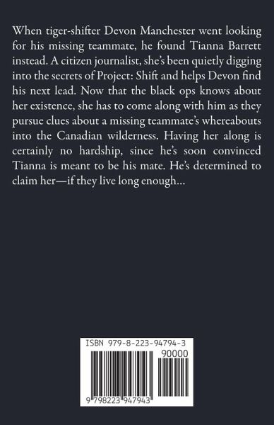 When tiger-shifter Devon Manchester went looking for his missing teammate, he found Tianna Barrett instead. A citizen journalist, she's been quietly digging into the secrets of Project: Shift and helps Devon find his next lead. Now that the black ops knows about her existence, she has to come along with him as they pursue clues about a missing teammate's whereabouts into the Canadian wilderness. Having her along is certainly no hardship, since he's soon convinced Tianna is meant to be his mate. He's determined to claim her-if they live long enough…