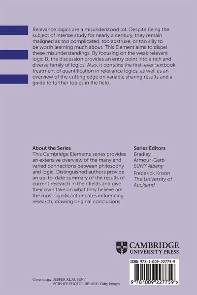 This Element aims to dispel misunderstandings on Relevance logics. It contains the first-ever textbook treatment of quantification in relevance logics, as well as an overview of the cutting edge on variable sharing results and a guide to further topics in the field.