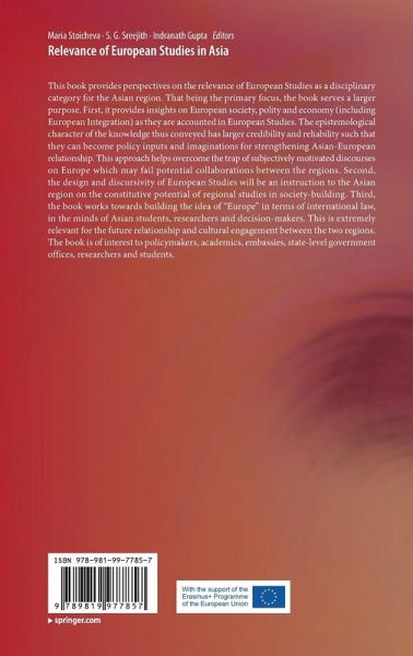 This book provides perspectives on the relevance of European Studies as a disciplinary category for the Asian region. That being the primary focus, the book serves a larger purpose. First, it provides insights on European society, polity and economy (including European Integration) as they are accounted in European Studies. The epistemological character of the knowledge thus conveyed has larger credibility and reliability such that they can become policy inputs and imaginations for strengthening Asian-European relationship. This approach helps overcome the trap of subjectively motivated discourses on Europe which may fail potential collaborations between the regions. Second, the design and discursivity of European Studies will be an instruction to the Asian region on the constitutive potential of regional studies in society-building. Third, the book works towards building the idea of "Europe" in terms of international law, in the minds of Asian students, researchers and decision-makers. This is extremely relevant for the future relationship and cultural engagement between the two regions. The book is of interest to policymakers, academics, embassies, state-level government offices, researchers and students.