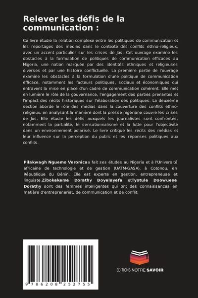 Ce livre étudie la relation complexe entre les politiques de communication et les reportages des médias dans le contexte des conflits ethno-religieux, avec un accent particulier sur les crises de Jos. Cet ouvrage examine les obstacles à la formulation de politiques de communication efficaces au Nigeria, une nation marquée par des identités ethniques et religieuses diverses et par une histoire conflictuelle. La première partie de l'ouvrage examine les obstacles à la formulation d'une politique de communication efficace, notamment les facteurs politiques, sociaux et économiques qui entravent la mise en place d'un cadre de communication cohérent. Elle met en lumière le rôle de la gouvernance, l'engagement des parties prenantes et l'impact des récits historiques sur l'élaboration des politiques. La deuxième section aborde le rôle des médias dans la couverture des conflits ethno-religieux, en analysant la manière dont la presse nigériane couvre les crises de Jos. Elle étudie les défis auxquels les journalistes sont confrontés, notamment la partialité, le sensationnalisme et la lutte pour l'objectivité dans un environnement polarisé. Le livre critique les récits des médias et leur influence sur la perception du public et les réponses politiques aux conflits.