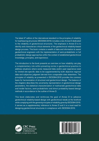 The latest 4th edition of the international standard on the principles of reliability for load bearing structures (ISO2394:2015) includes a new Annex D dedicated to the reliability of geotechnical structures. The emphasis in Annex D is to identify and characterize critical elements of the geotechnical reliability-based design process. This book contains a wealth of data and information to assist geotechnical engineers with the implementation of semi-probabilistic or full probabilistic design approaches within the context of established geotechnical knowledge, principles, and experience.