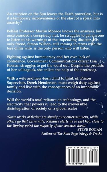 An eruption on the Sun leaves the Earth powerless, but is it a temporary inconvenience or the start of a spiral into anarchy? Belfast Professor Martin Monroe knows the answers, but once branded a conspiracy nut, he struggles to get anyone to listen to his warnings of the impending disaster. His only friend, Simon Wilson, still coming to terms with the loss of his wife, is the only person who will listen. Fighting against bureaucracy and her own lack of confidence, Government Communications officer Lisa Keenan struggles to get the word out. Despite the protests of her colleagues, she enlists the help of the professor. With a wife and new-born child to think of, Prison Supervisor, Derek Henderson, must weigh duty against family and live with the consequences of an impossible decision. Will the world's total reliance on technology, and the electricity that powers it, lead to the irreversible disintegration of society on a global scale? 'Some works of fiction are simply pure entertainment, while others go that extra mile; Reliance alerts us to just how close to the tipping-point the majority of our societies dwell.'- STEVE ROGAN - Author of The Rain Saga trilogy & Tracks