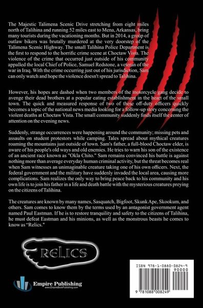 Talihina is a small town nestled in the mountains of southeastern Oklahoma, in the heart of the Choctaw Nation. Like most small towns, life in Talihina moves at a slower pace than in big cities. The citizens peacefully go about their daily lives at a steady pace. With few strangers in Talihina, there are not many secrets. Most people carry on relationships with the same friends and neighbors they've known their whole lives. Talihina has very little excitement, except for the autumn and spring months when the vacationers from out-of-state flock in, especially from the nearby Texas and Arkansas borders, to enjoy the seasonal changes. The Talimena Scenic Drive is one of the favorite attractions for tourist groups. Stretching from eight miles north of Talihina and running 52 miles east to Mena, Arkansas offers majestic autumn colors, spring flowers, and mountain vistas. Something abruptly broke the pleasant routine in autumn of 2014 when a group of outlaw bikers was brutally murdered at the very doorstep of the Talimena Scenic Highway. The small Talihina Police Department is the first to respond to the horrific crime scene at Choctaw Vista. The violence of the crime that occurred just outside of his community appalled the local Chief of Police, Samuel Redstone, a veteran of the war in Iraq. With the crime occurring just out of his jurisdiction, Sam can only watch and hope the violence doesn't spread to Talihina. His hopes are dashed, however, when two members of the motorcycle gang decide to avenge their dead brothers at a popular eating establishment in the heart of the small town. The quick and measured response of two of these off-duty officers quickly becomes a topic of the national news media looking for a follow-up story concerning the violent deaths at Choctaw Vista. The small community suddenly finds itself the center of attention on the evening news. Adding to this, strange occurrences were suddenly happening around the community; missing pets, student protestors being assaulted by a strange creature at night while camping at a local lake. Tales spread about mythical creatures roaming the mountains just outside of town. Sam Redstone suddenly finds himself with dilemmas, both professional and personal. Just as Sam embarks on dating a beautiful Oklahoma Highway Patrol officer, suddenly, his old flame moves back into the community with her new husband, who was a lawyer of questionable ethics and enough money to force his will on many people in the small town. Now overwhelmed with mysterious events and his own romantic confusion, Sam is slow to see the unnatural nature of the threats to his community. His father, a full-blood Choctaw elder, is aware of his people's old ways and old enemies. He tries to warn his son of the existence of a race of beings known as "Okla Chito." Sam remains convinced his battle is against nothing more than average everyday human criminal activity. Because Sam was oblivious to the real threat, he wasn't ready to comprehend what he was really dealing with. Not until he witnesses an unimaginable creature taking one of his officers. Next, the federal government and the military have suddenly invaded the local area, causing more complications. Sam realizes the only way to bring peace back to his community and his own life is to join his father in a life and death battle with the mysterious creatures preying on the citizens of Talihina. The creatures are known by many names, Sasquatch, Bigfoot, Skunk Ape, Skookum, and others. Sam comes to know them by the terms used by an antagonist government agent named Paul Eastman. If he is to restore tranquility and safety to the citizens of Talihina, he must defeat Eastman and his minions, as well as the monstrous beasts he comes to know as "Relics."