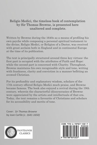 Religio Medici, the timeless book of contemplation by Sir Thomas Browne dating to 1642, is presented here unaltered and complete. Written by Browne during the 1640s as a means of profiling his own psyche while composing a personal spiritual testament to the divine, Religio Medici, or Religion of a Doctor, was received with great acclaim both in England and in continental Europe at the time of its publication. The text is principally structured around three key virtues: the first part is occupied with the attributes of Faith and Hope; while the second part is concerned with Charity. Throughout, Browne maintains his own recognisable style and tone, writing with frankness, clarity and conviction in a manner befitting an avowed Christian. For its profundity and explanatory wisdom, scholars of the 17th century offered Religio Medici much praise, and Browne became famous. The book also enjoyed a revival during the 19th century, wherein the characterful idiosyncrasies of Browne were appreciated by the artists and intellectuals of that era. Today, the text remains a favourite of Christians and scholars for its accessibility and merits of tone.