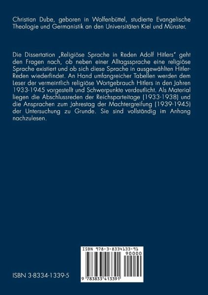 Die Dissertation "Religiöse Sprache in Reden Adolf Hitlers" geht den Fragen nach, ob neben einer Alltagssprache eine religiöse Sprache existiert und ob sich diese Sprache in ausgewählten Hitler-Reden wiederfindet. An Hand umfangreicher Tabellen werden dem interessierten Leser der vermeintlich religiöse Wortgebrauch Hitlers in den Jahren 1933-1945 vorgestellt und Schwerpunkte verdeutlicht. Als Material liegen die Abschlussreden der Reichsparteitage (1933-1938) und die Ansprachen zum Jahrestag der Machtergreifung (1939-1945) der Untersuchung zu Grunde. Sie sind vollständig im Anhang nachzulesen.