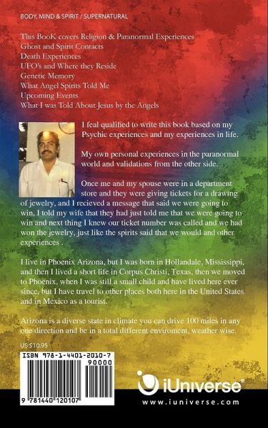 This BooK covers Religion & Paranormal Experiences Ghost and Spirit Contacts Death Experiences UFO's and Where they Reside Genetic Memory What Angel Spirits Told Me Upcoming Events What I was Told About Jesus by the Angels
