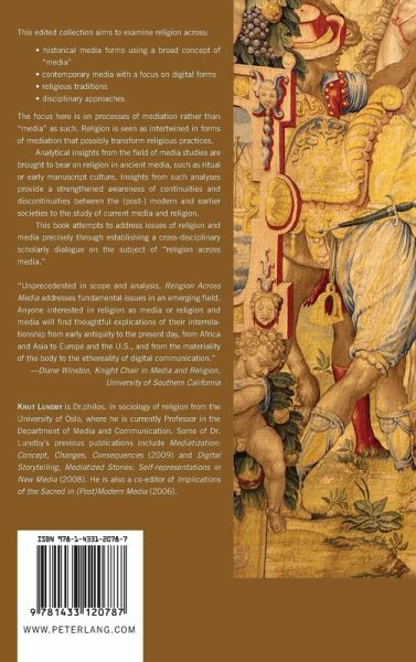 «Unprecedented in scope and analysis, Religion Across Media addresses fundamental issues in an emerging field. Anyone interested in religion as media or religion and media will find thoughtful explications of their interrelationship from early antiquity to the present day, from Africa and Asia to Europe and the U.S., and from the materiality of the body to the ethereality of digital communication.» (Diane Winston, Knight Chair in Media and Religion, University of Southern California)